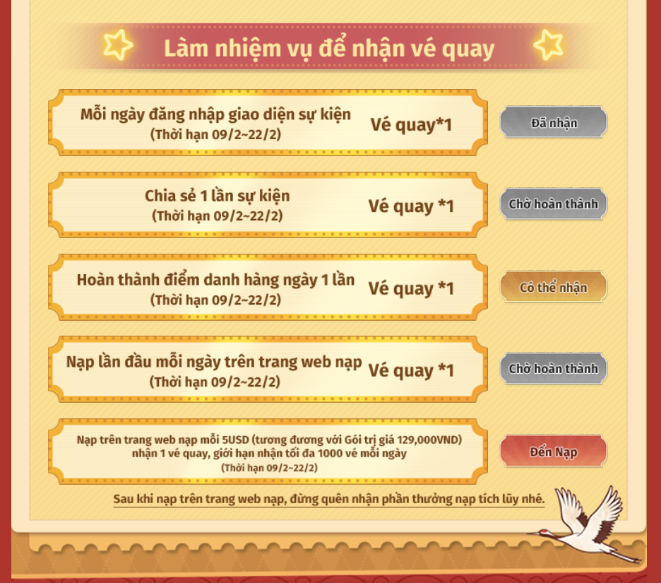 Lưu ý, thời gian và nội dung sự kiện có thể thay đổi tùy theo từng máy chủ. Người chơi vui lòng theo dõi thông tin hiển thị trong game để cập nhật lịch sự kiện chính xác nhất.